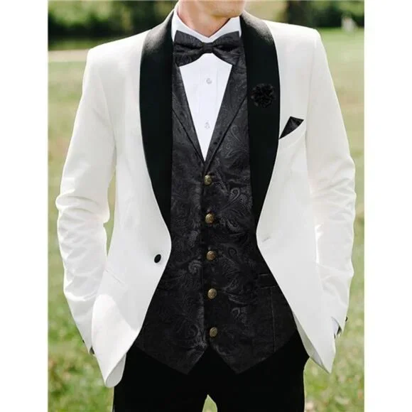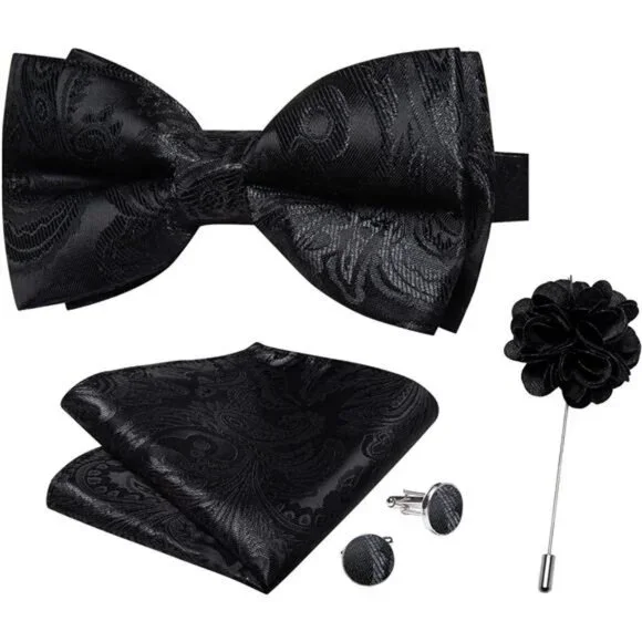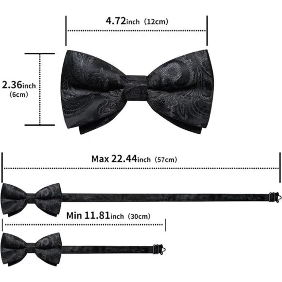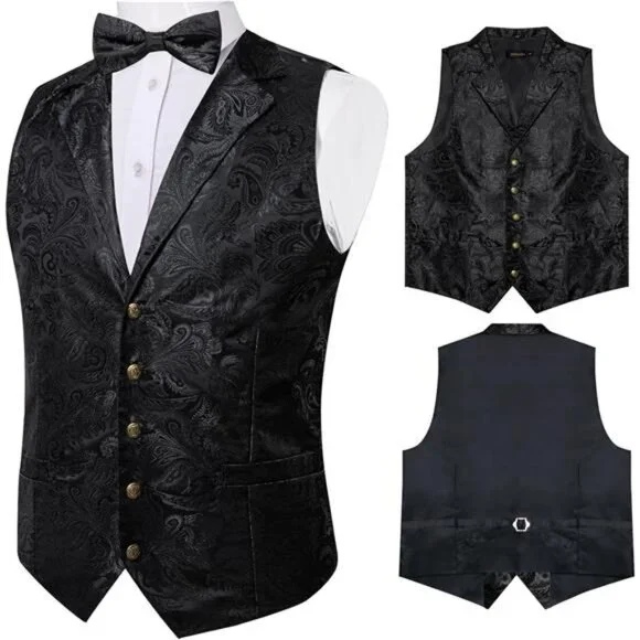 Vest and Bow Tie Sets for Men. Elegant victorian style shawl collar design, large area gorgeous silk jacquard fabric, breathable and comfortable polyester backingMens Paisley Vest + Pre-Tied Bow Tie + Pocket Square + Cufflinks + Lapel Pin. V-Neck Mens Dress Vest, available in 6 sizes S, M, L, XL, 2XL, 3XL. The mens bow tie fits neck circumference of 11-19 inches, comes with 9 inch handkerchief and a pair of stainless steel cufflinksThe Vest and Bow Tie are both made of 80% Silk and 20% Polyester, balancing appearance and practicality. Dry clean, hand wash and machine washable, no fading, no distortion, not easy to pilling