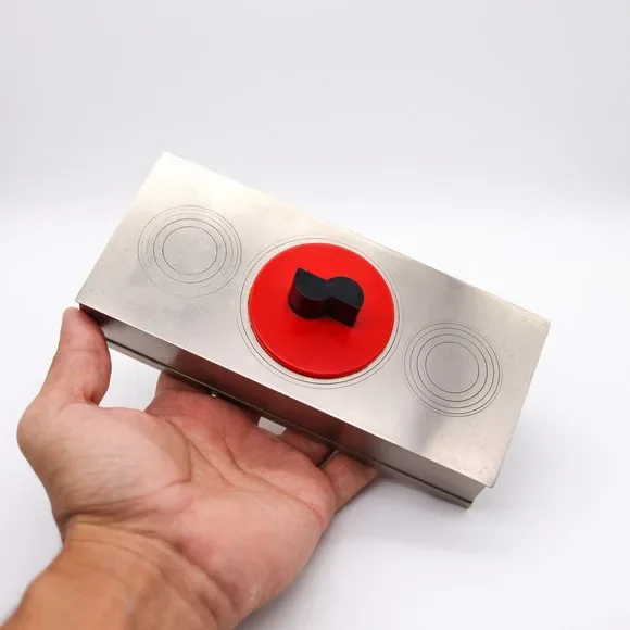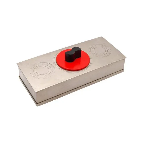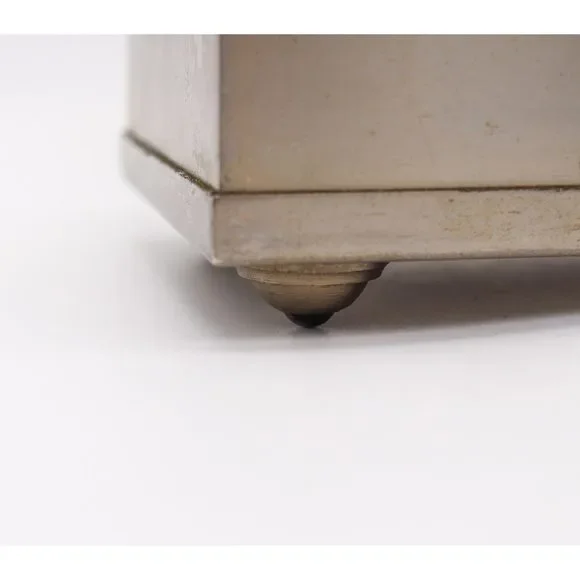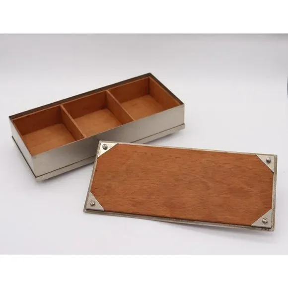 Geometric art deco box designed by Chase Usa Co.Beautiful Streamline geometric box, created during the Art Deco period by the Chase USA Co., back in the 1930. This trinket box has been designed with three compartments in the interior lined up in fine cedar wood and a lid in solid polished gunmetal steel. The lid is decorated with incised circles and elements made up in black and red bakelite. It is mount in four footed swivel spheres.Carefully crafted with streamline patterns and solid construction. This surely is a very decorative piece and a great conversation item in gorgeous and exceptional preserved in almost mint condition.This highly decorative box is suitable for cigarettes, cufflinks, jewelry, any piece of memorabilia or just for decoration.Weight: 581.95 Grams, (1.28 Pounds).Measurements: 181 mm by 80 mm by 65 mm (7.12 x 3.14 x 2.56 Inches).Hallmarks: Stamped with the maker's mark of the Centaur Archer and signed, "CHASE USA".Condition: The overall condition of this box is excellent. Beside the little normal wear, there is no damage to any parts. All pieces are secured and has been carefully inspected to guarantee the condition and authenticity.INVENTORY REF: D042023MROY/.1132