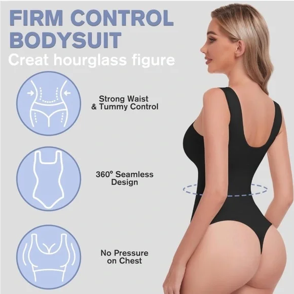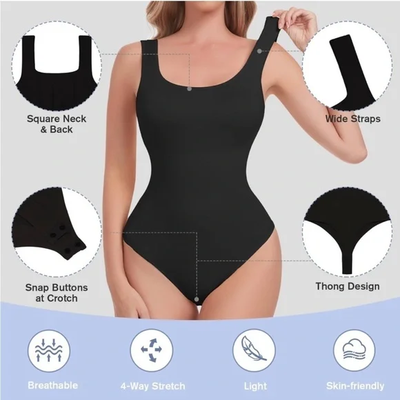 Shapewear Bodysuit for Women| Tummy Control| Thong| Square Neck| Body ShaperColor: BlackListings for nude is also available Fabric: The shapewear bodysuit is made from a blend of 85% nylon and 15% spandex, which is lightweight, breathable, highly elastic, and soft. Conform to the body's shape, providing a snug and secure fit while helps to smooth and shape the body, giving a more streamlined appearance. It feels gentle against the skin, reducing any potential irritation or discomfort. The softness also contributes to a seamless and invisible look under clothing, ensuring a smooth silhouette.A27